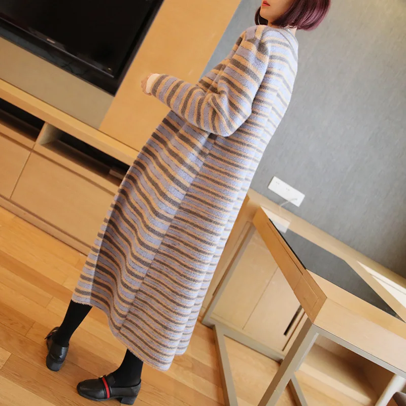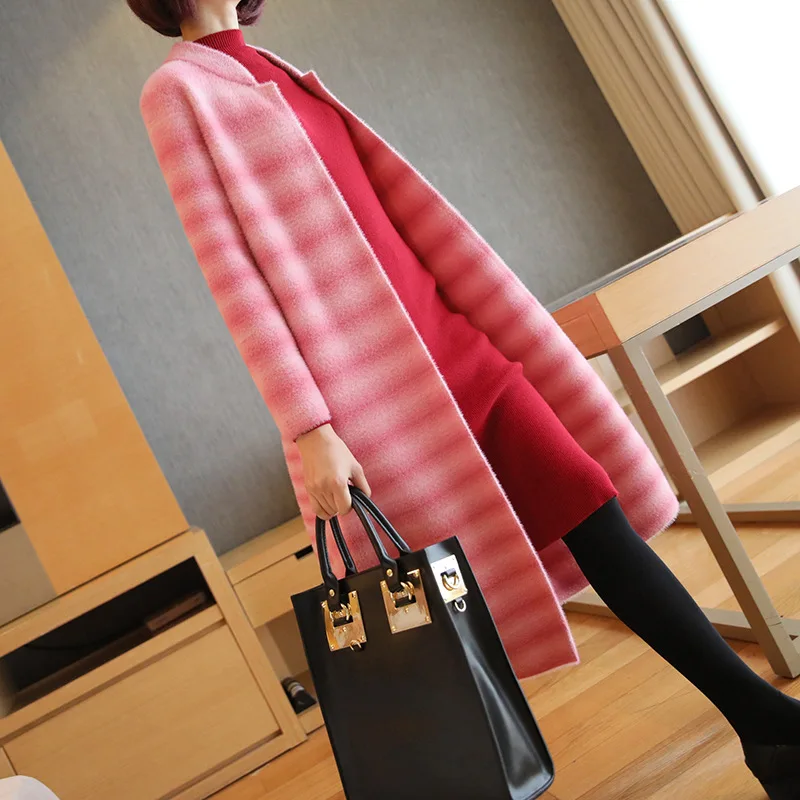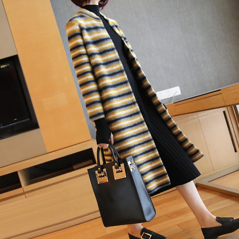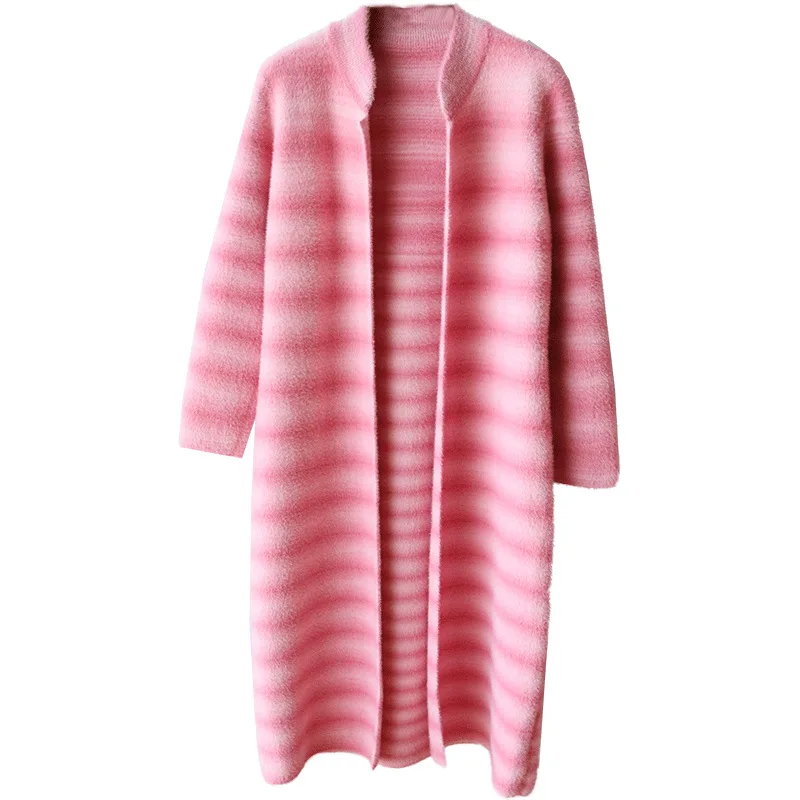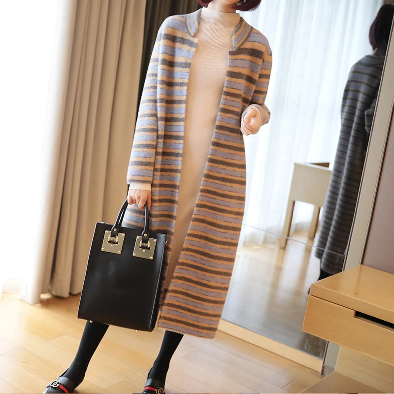 Big Sale Temperament mink cashmere cardigan sweater coat female 2019 new long-sleeved striped thick loose kn
