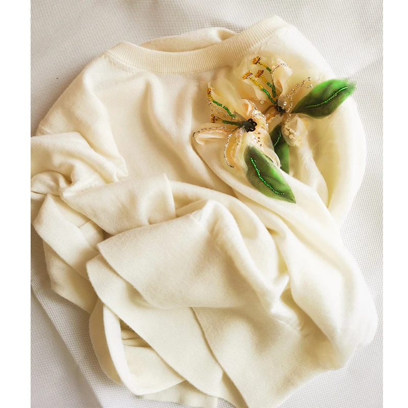 Buy Cosmicchic Wool Cashemire White Pullover Long Sleeve O Neck 3D Flower Sweater Lily Beading Women's