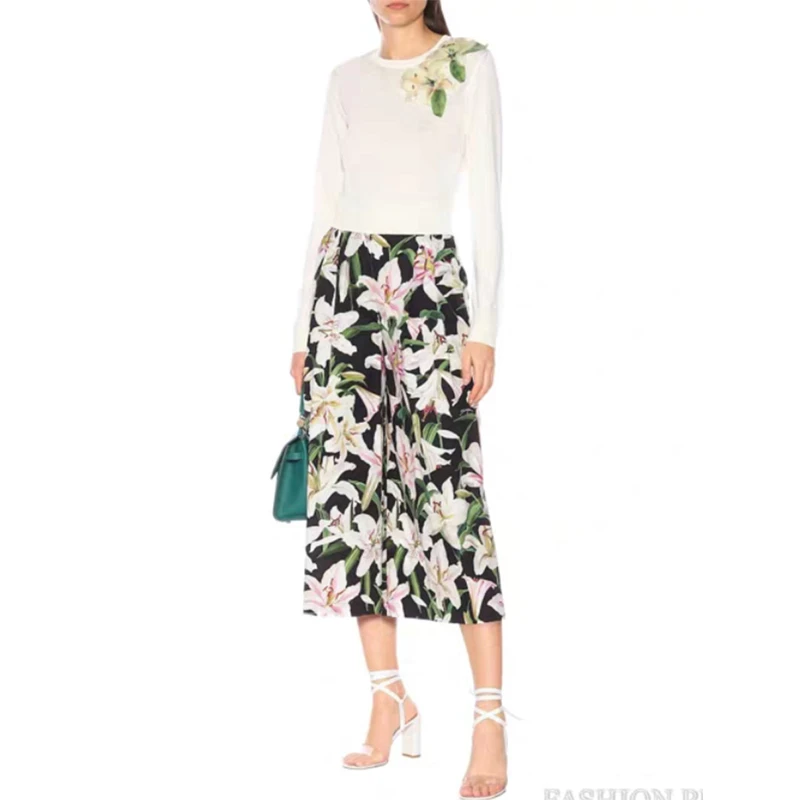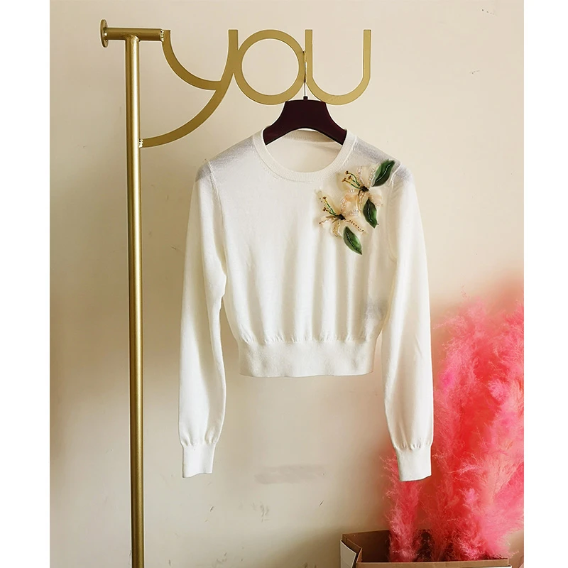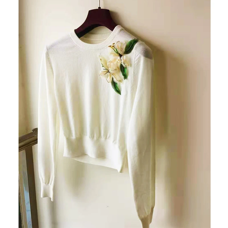 Discount Cosmicchic Wool Cashemire White Pullover Long Sleeve O Neck 3D Flower Sweater Lily Beading Women's