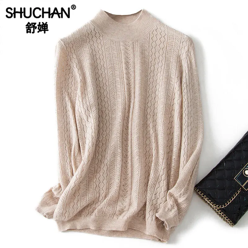 Hot Promo Shuchan Hollow Out Thin Womens Sweaters 90% Wool+10% Cashmere Cute Sweater O-Neck Pullovers White B