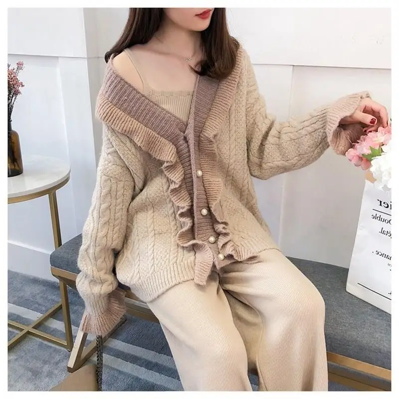 Hot Product Women Winter Ruffles Patchwork Sweater Coat Female Flare Sleeve Loose Cardigans Elegant V Neck Bead
