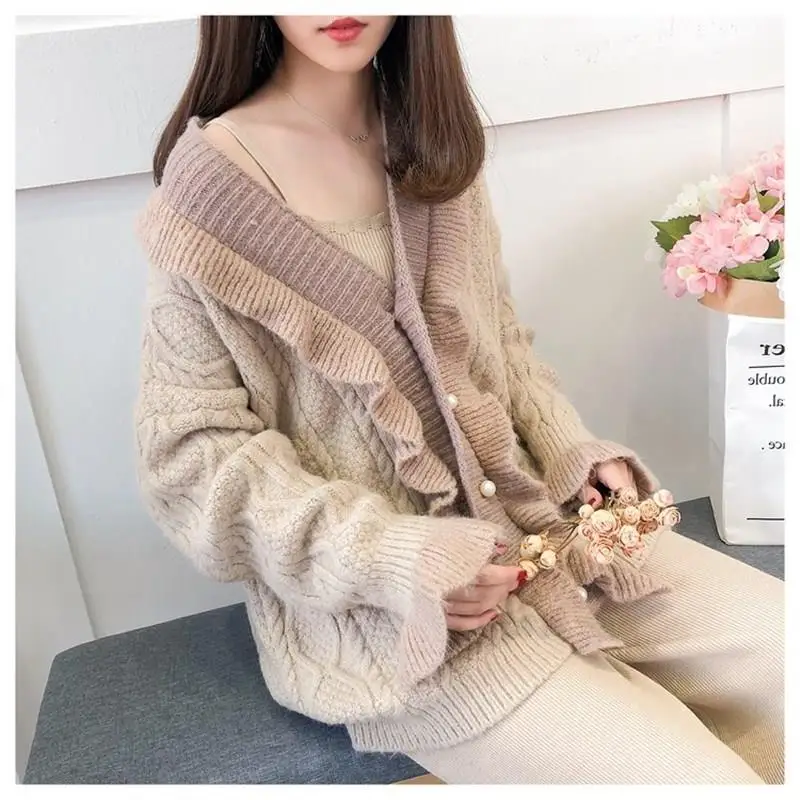 Promo Women Winter Ruffles Patchwork Sweater Coat Female Flare Sleeve Loose Cardigans Elegant V Neck Bead