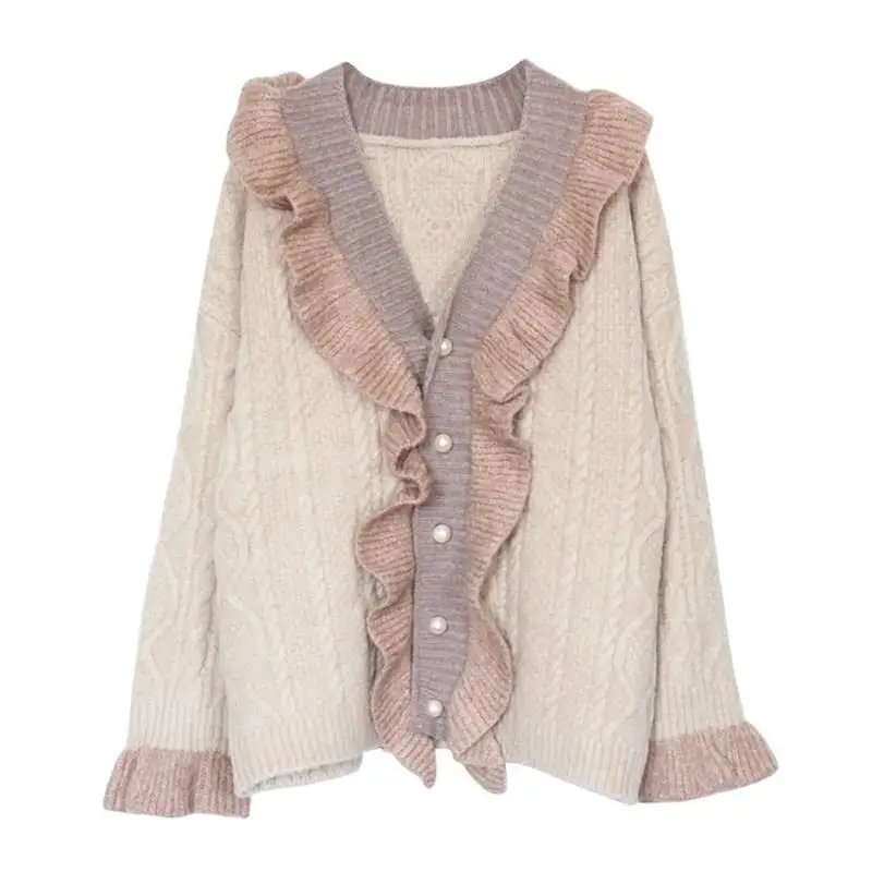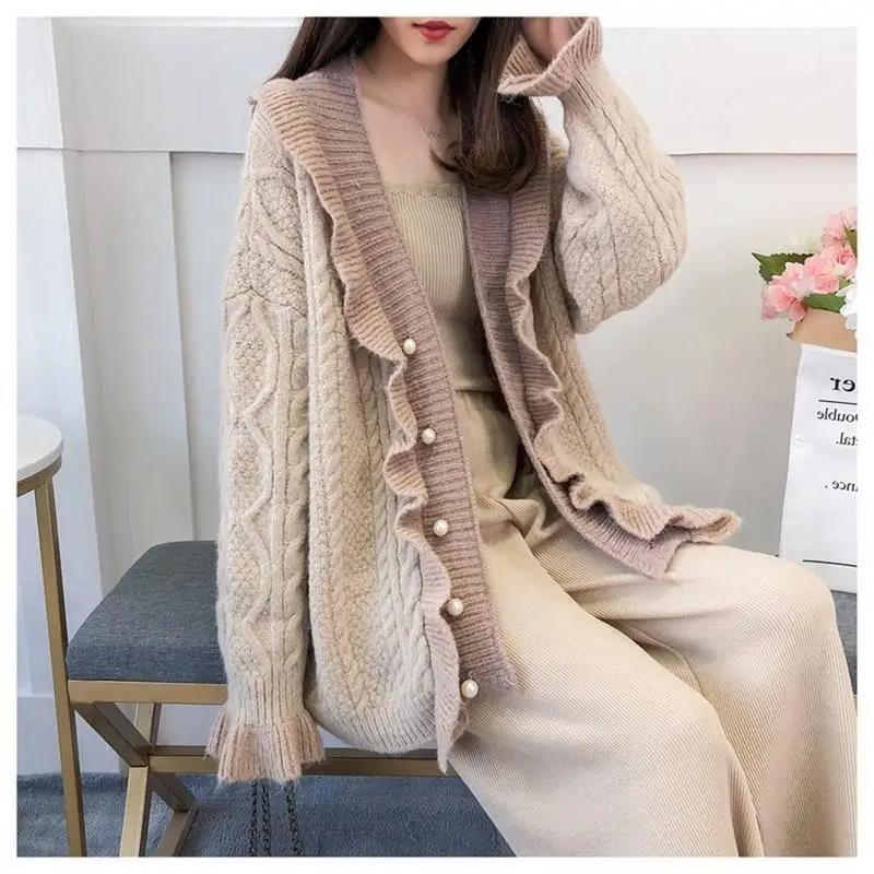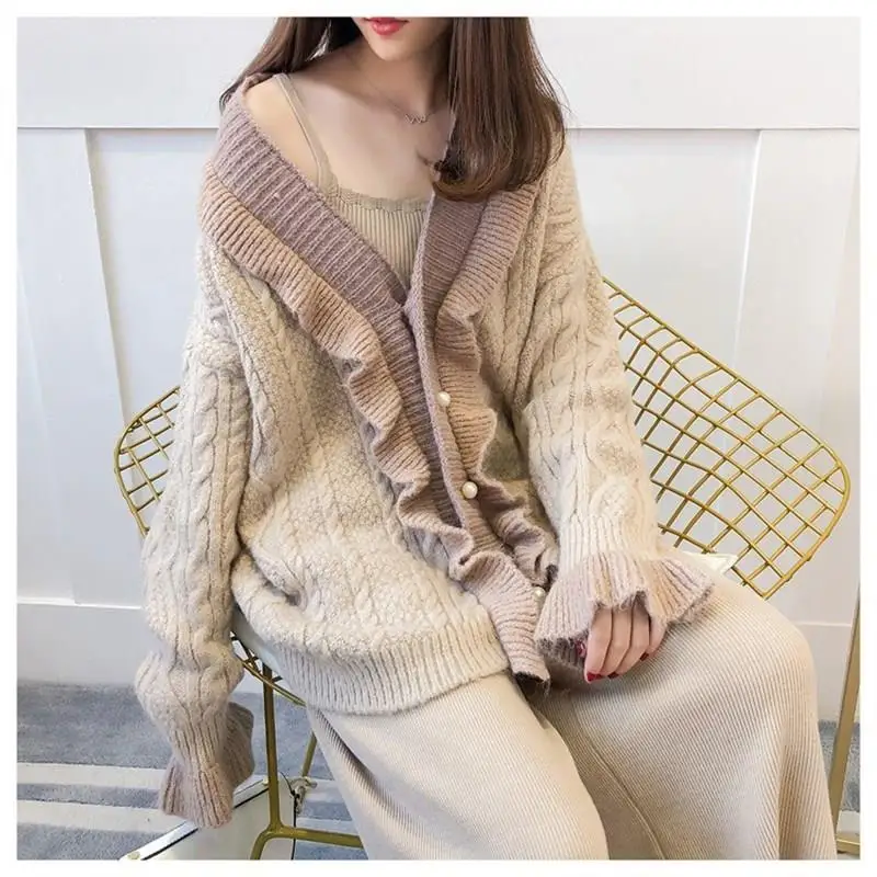 New Arrival Women Winter Ruffles Patchwork Sweater Coat Female Flare Sleeve Loose Cardigans Lady Elegant V Neck