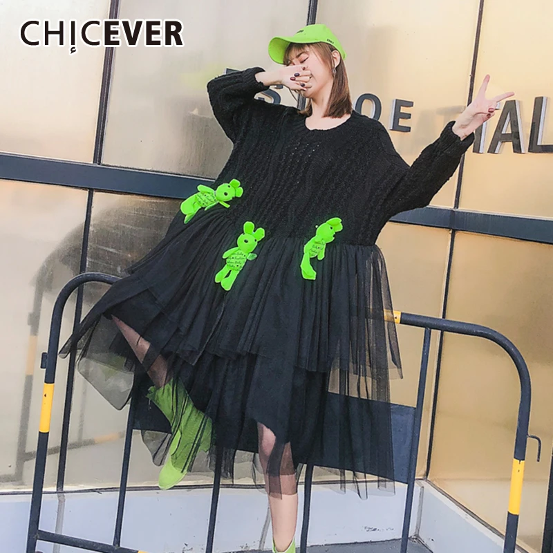 Big Discount CHICEVER Patchwork Mesh Cartoon Knitted Sweater Women O Neck Long Sleeve Irregular Loose Pullovers