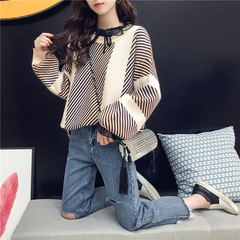 Discount Women Sweater Spring Autumn 2019 New Retro Striped Female Knitwear Sweater Loose Round Neck Knitted