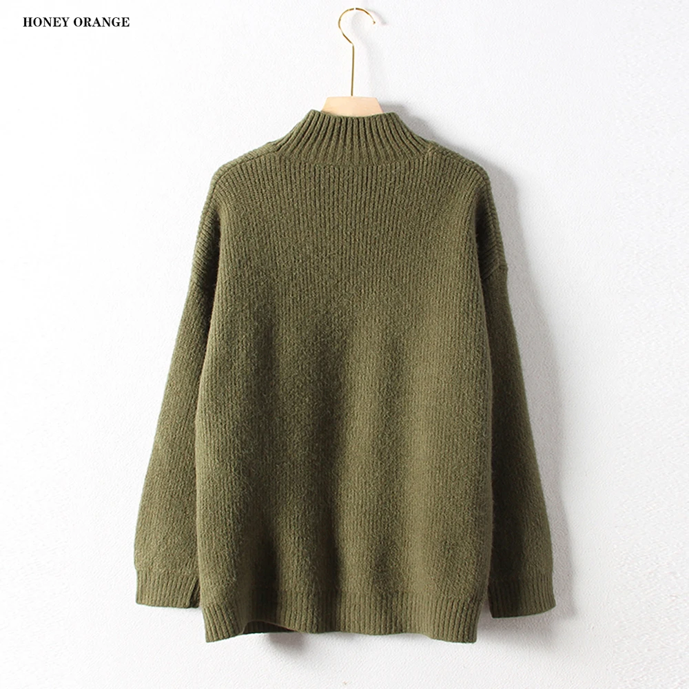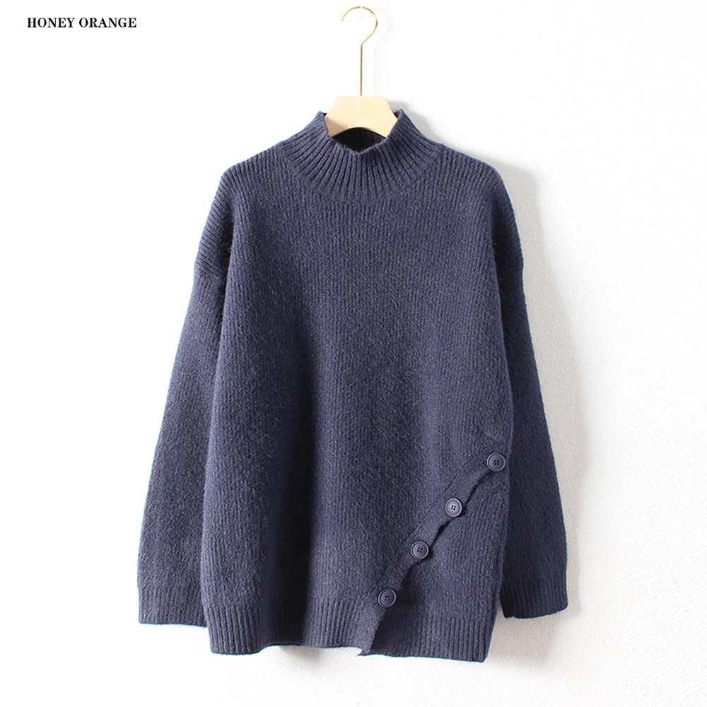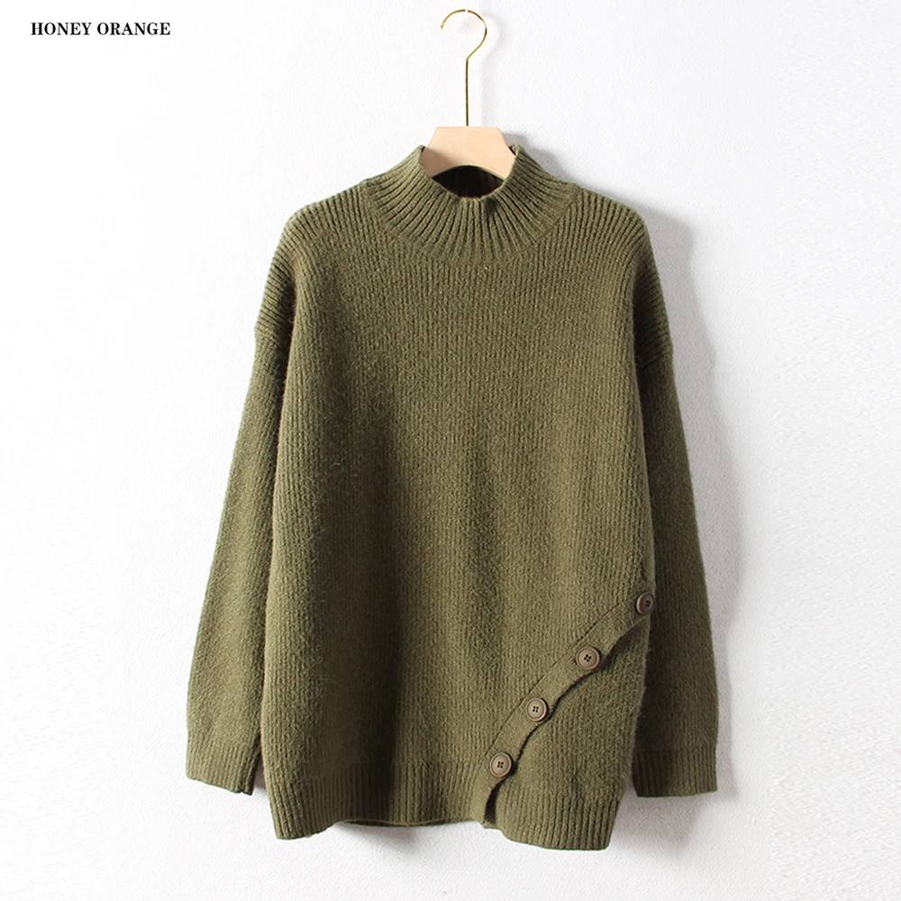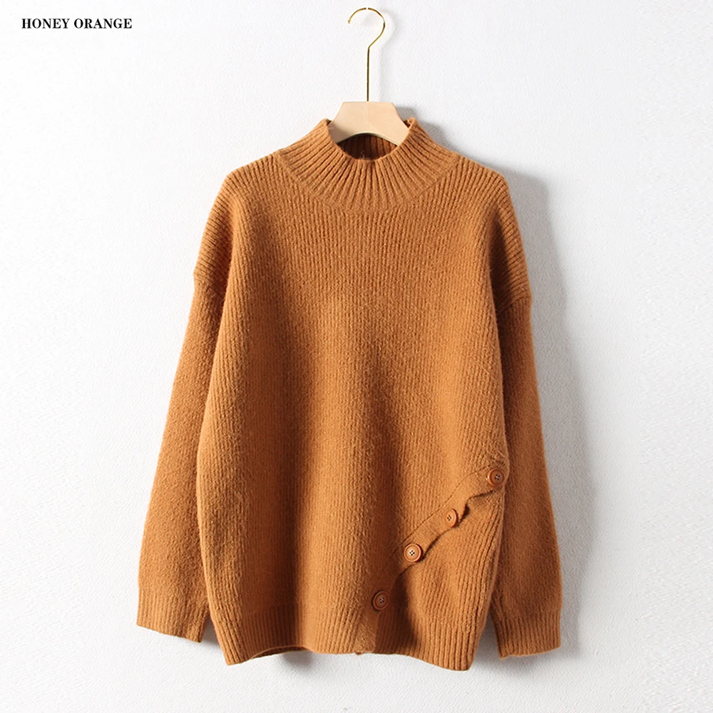 Discount women's sweater turtleneck pullover full sleeve with button thick solid color warm casual soft knit