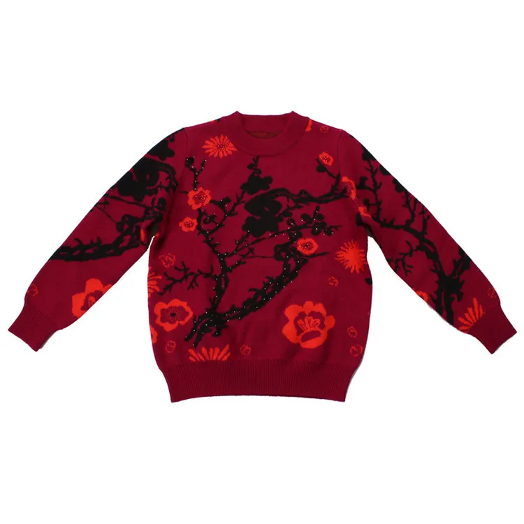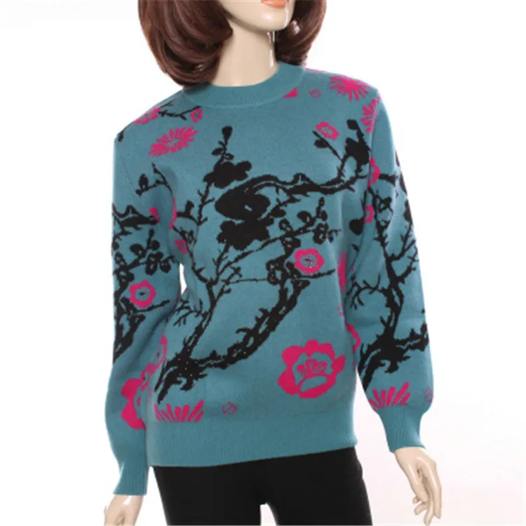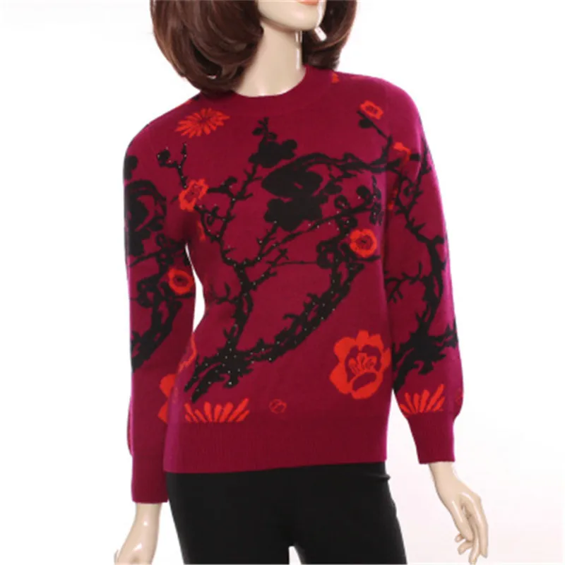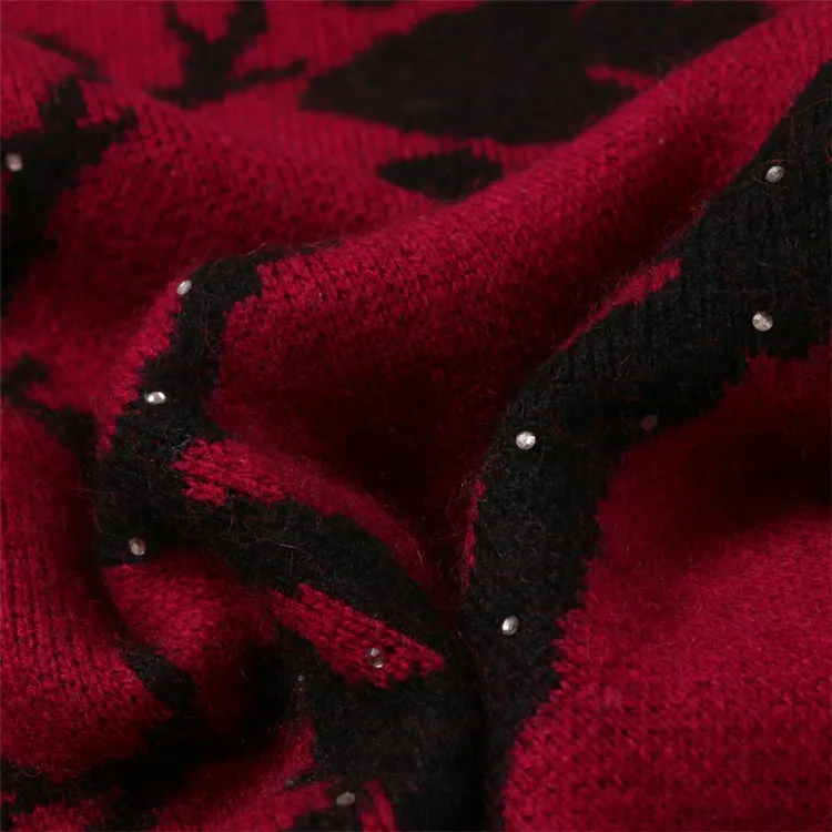 Hot Product large size 100%goat cashmere semi-high collar thick knit women printed beads sequins pullover sweat