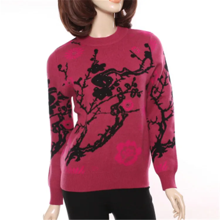 Buy large size 100%goat cashmere semi-high collar thick knit women printed beads sequins pullover sweat