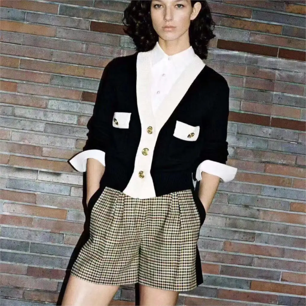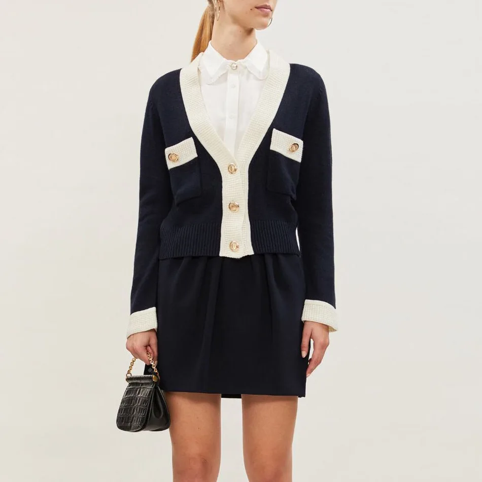 Promo 2019 autumn and winter V neck long sleeve small fragrant spell color high-quality trim knit cardiga
