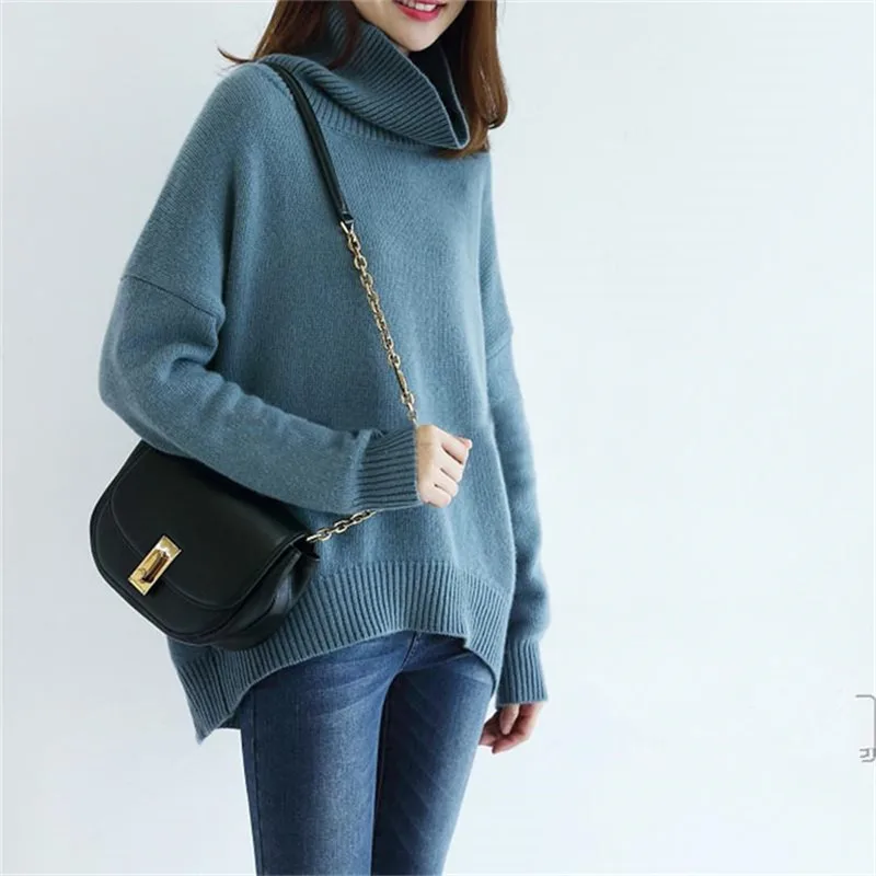 Discount goat cashmere thick knit women fashion high collar long irregular hem pullover sweater solid color